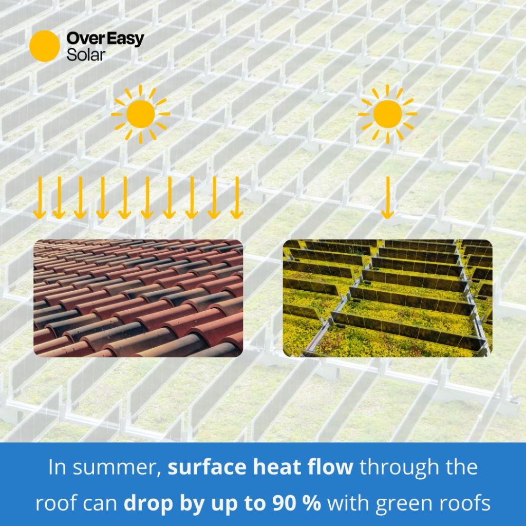 Og det bliver bedre: Grønne tage kan reducere varmestrømmen gennem taget med op til 90%, hvilket hjælper med at holde bygninger køligere, reducere energiforbruget og lette presset på byernes kølesystemer ❄️