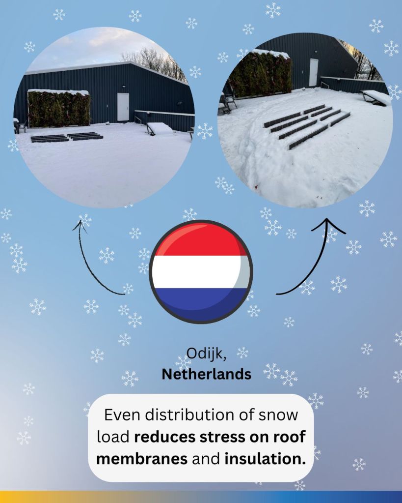 Vores paneler fanger ikke sne eller overbelaster taget – sneen lægger sig jævnt og smelter hurtigere takket være luftcirkulation og strålingsvarmeopsamling.